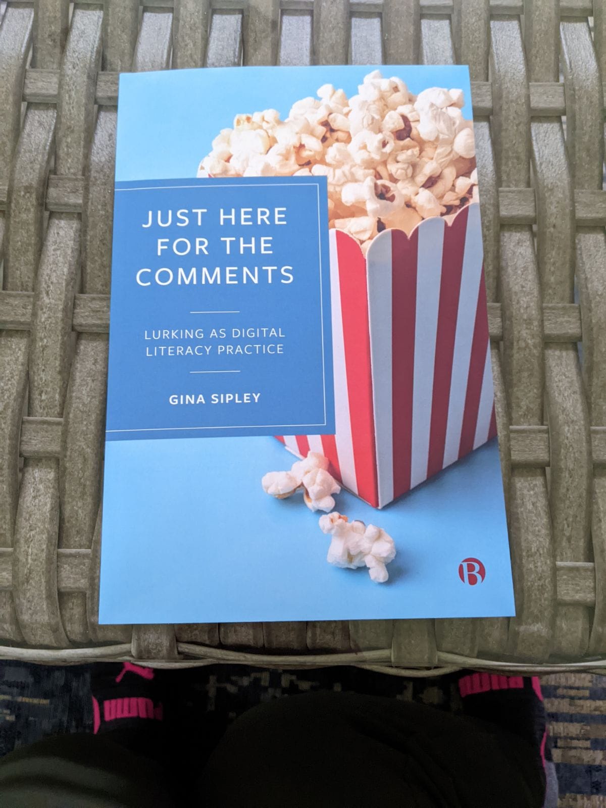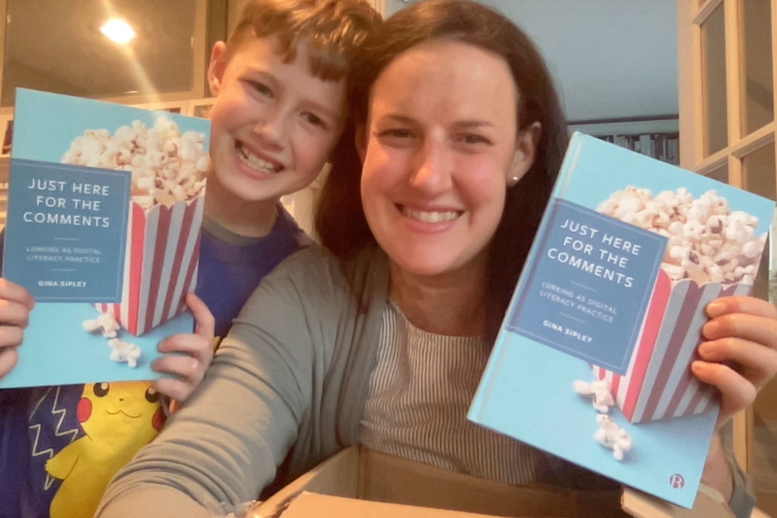 It's 30ish days to go until Just Here For The Comments: Lurking as Digital Literacy Practice is released. A few author copies earmarked for libraries arrived early and this allowed me to share with my kids (and my husband) that the book was dedicated to them. When the box arrived and my youngest realized that the surprise inside was neither toys, nor snacks, a few tears ensued. The elder was a bit more enthusiastic, so we snapped a commemorative photo.