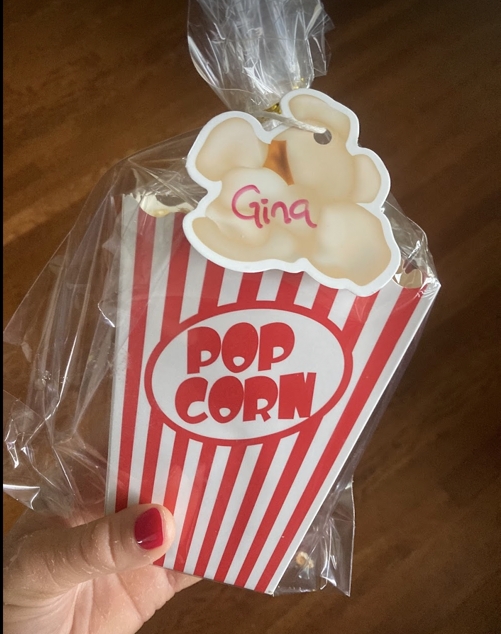 Two neighborhood friends organized a dinner party salon, which included these nifty popcorn buckets filled with homemade caramel popcorn.