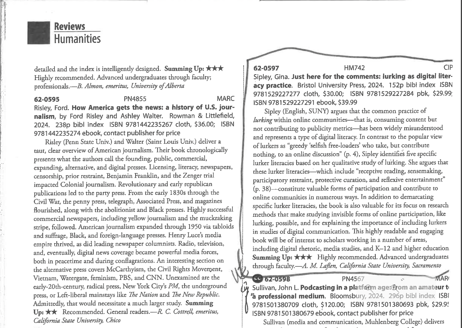 Choice Magazine the Journal of the American Library Association reviewed Just Here For the Comments and gave it a Three Star -Highly Recommend - distinction. A nice way to end the year!