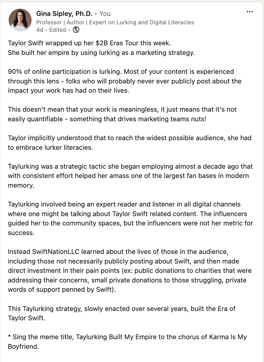 Speaking of Taylor Swift, my colleague the poet Amy King, invited me (alongside our Creative Writing Faculty) to a global reading held over Zoom by the Hudson Valley Writers Center to celebrate the launch of Invisible Strings: 113 Poets Respond to the Songs of Taylor Swift (Edited by Kristie Frederick Daugherty). Every great living poet is in this anthology (Diane Seuss, Cornelius Eady, Ilya Kaminisky, Maggie Smith, etc). In true Swiftie fashion, each poem contains Easter eggs to one of her songs and readers are tasked with determining which songs the poem is about.