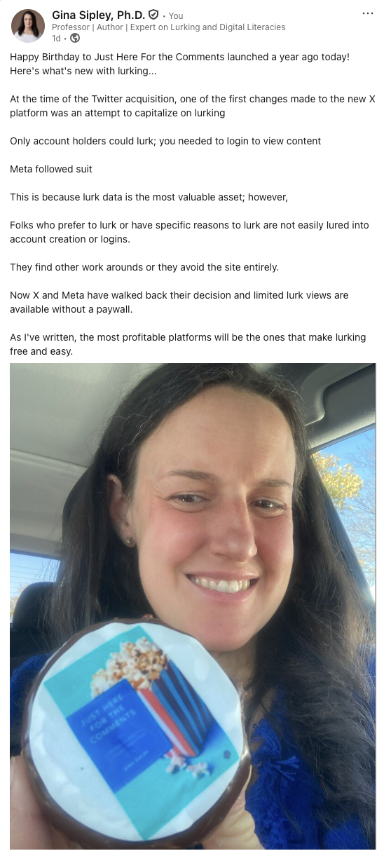To be perfectly honest, one of the greatest struggles has been to commit to writing a monthly newsletter. It's a new genre for me and one that I am learning how to navigate. I had only one goal for this past year: write once a month and post on LinkedIn once a week. Where I plan to put more time into narrowing the scope and content of this newsletter over the next year, I'm proud to have about 100 dedicated readers across the U.S., Canada, Europe and Australia with 80% of subscribers opening every issue. Considering that most successful newsletters only have an open rate of 25%, I'll take this as a win. However, as a social media scholar, I admit that the open-rate data is a bit misleading. I have sometimes received a message from someone about the content in my newsletter and although they are a subscriber, their reading is not measured in the open rate. Through some informal data collection and sleuthing, this seems to be because they viewed the content within their mail program, rather than opening a new browser window. Similarly, I'm sure that there are folks who open the newsletter, are registered on the backend as having opened, and then only read a sentence and move on to something else. As I write in Just Here For the Comments, measuring reading and measuring engagement are two separate metrics and ones that should not be conflated.