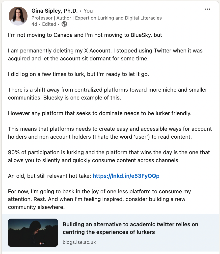 As I wrote to a friend: I'm sure there's lots of great stuff happening over on Bluesky. It's also a frenzied FOMO period where folks are trying to rapidly rebuild and scale communities on a new site. For sure, there's a benefit in being first to market, and for some it is an economic necessity to be there right now. But, no platform is a panacea and fully immune to the problems that plague/d other platforms.