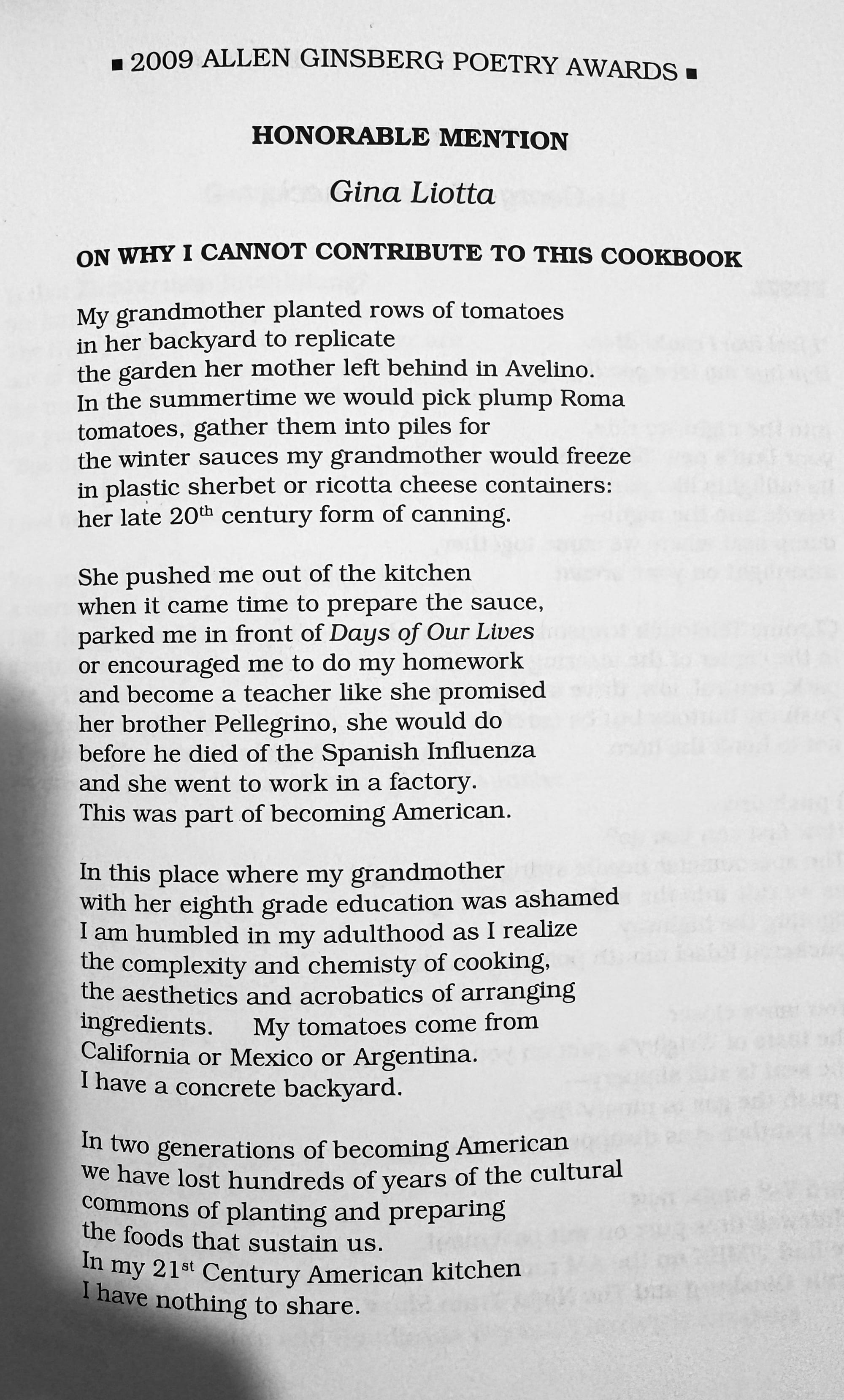 At the time I was working at a school that was organizing a cookbook fundraiser and my students asked the faculty to each contribute a recipe to the cookbook. If you know me, you know that I mostly cook for survival, not pleasure. So, instead of a recipe, I gave them this poem and they included it in their cookbook. I don't have the cookbook anymore, but I still have my copy of The Paterson Literary Review.